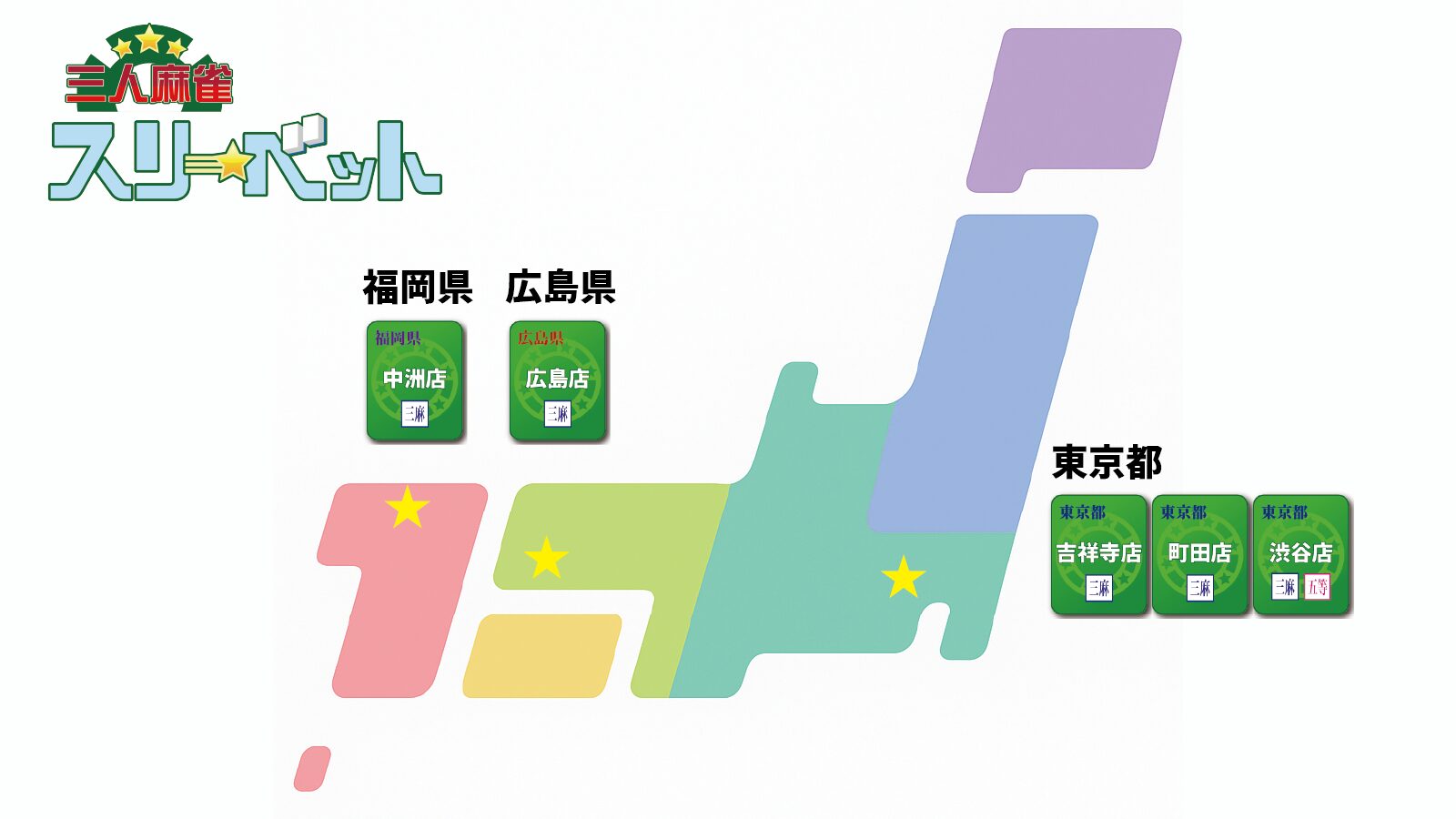 三人麻雀スリーベットの全店舗一覧ページです。吉祥寺・町田・渋谷・広島・中洲の各店とも、清潔感のある店内と明るいスタッフで安心して遊べる三麻専門店です。初めての方でも楽しめる環境をご用意しています。